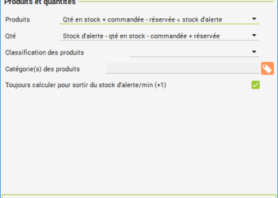 Cet assistant est entièrement paramétrable afin de répondre à tous les besoins (par exemple : calculs sur stock d'alerte, sur la quantité réservée, sur le délai de réapprovisionnement, etc.).