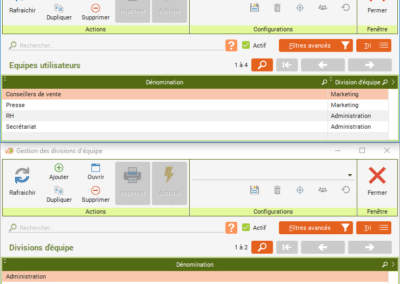 Dans l’onglet « Outils » du menu principal, cliquez sur « Données de base» puis sur « Droits d'accès » puis sur « Equipes utilisateurs » ou « Divisions d'équipe » pour gérer les équipes ou divisions.