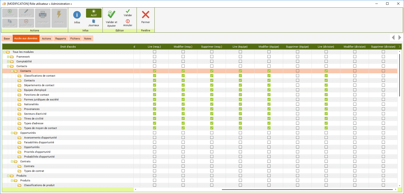 Cliquez sur « Rôles utilisateurs » pour gérer les droits d'accès. Les colonnes avec les suffixes (équipe) et (division) permettent de définir les droits si l'utilisateur fait partie de la même équipe ou de la même division que le propriétaire de l'enregistrement.