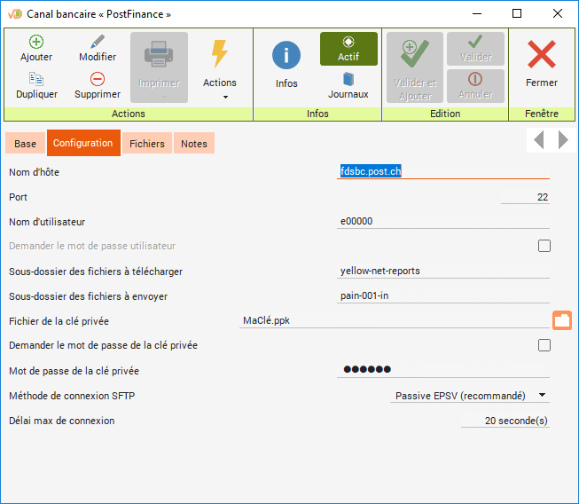 Dans l’onglet « Outils » du menu principal, cliquez sur « Données de base » puis sur « Banques » puis sur « Canaux bancaires ». Ajoutez un nouveau canal avec le type « SFTP » et configurez les données d'accès selon les informations fournies par PostFinance.