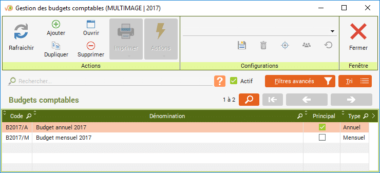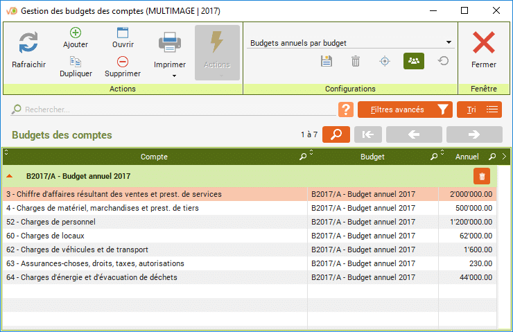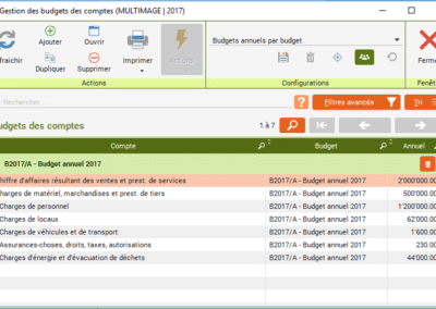 Les montants budgétés par compte ou par centre analytique peuvent être saisis dans « Budgets des comptes » et dans « Budgets des centres ».