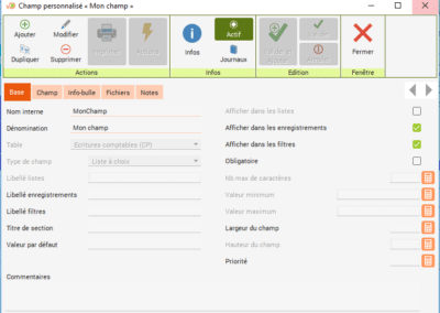 Dans l’onglet « Outils » du menu principal, cliquez sur « Données de base » puis sur « Champs personnalisés ». Ajoutez les nouveaux champs selon vos besoins.