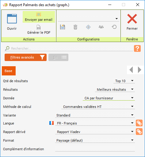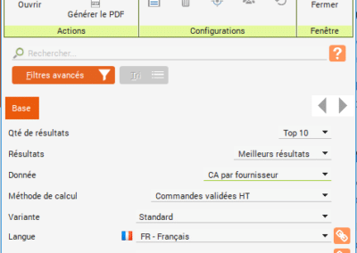 Cliquez sur « Palmarès des activités », « Palmarès des commissions des ventes » ou « Palmarès des achats » depuis les menus « Rapports » des onglets « Activités », « Ventes » et « Achats ».