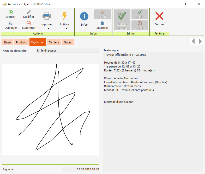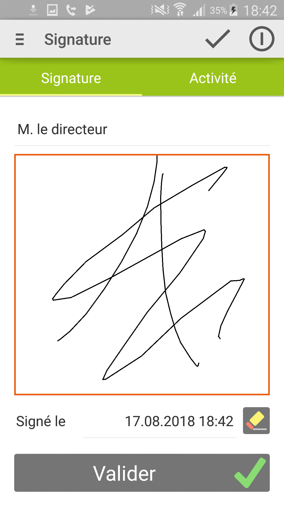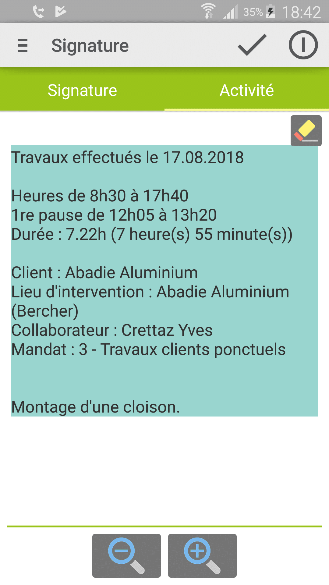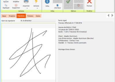 Le client lit les données de l'intervention (heures, travaux effectués, lieu d'intervention, etc.) puis signe avec le doigt. Si ces données sont modifiées après coup, la signature est automatiquement annulée.