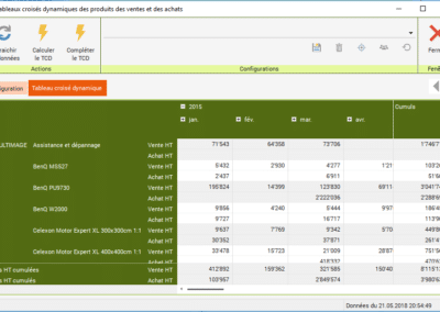 Cliquez sur les menus « Stats » depuis les onglets « Ventes », « Achats » et « Activités » pour ouvrir les tableaux croisés dynamiques.