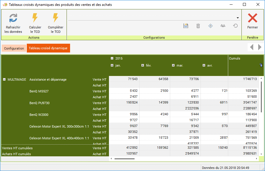 Seuls les tableaux croisés dynamiques sur les ventes sont disponibles, sans détails par produit.