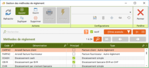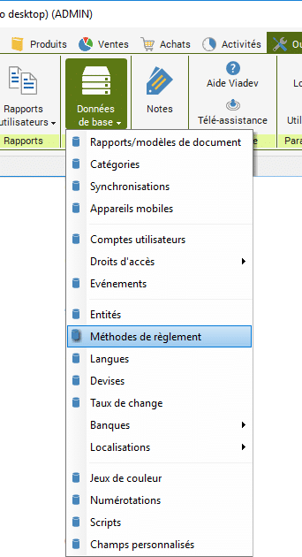 Dans le ruban « Outils », cliquez sur « Données de base » puis sur « Méthodes de règlement ».