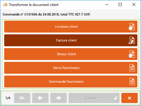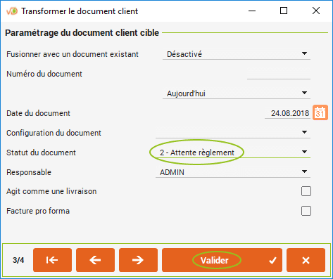 Lors des prochaines utilisations de cet assistant pour transformer une commande en facture, vous pourrez cliquer directement sur « Valider » si vous voulez conserver les mêmes paramètres que ceux que vous aurez définis ci-dessous.