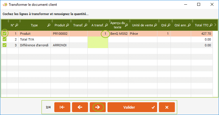 Si vous ne voulez pas facturer l'intégralité des produits, décochez les produits à ne pas facturer ou réduisez la quantité à transférer.