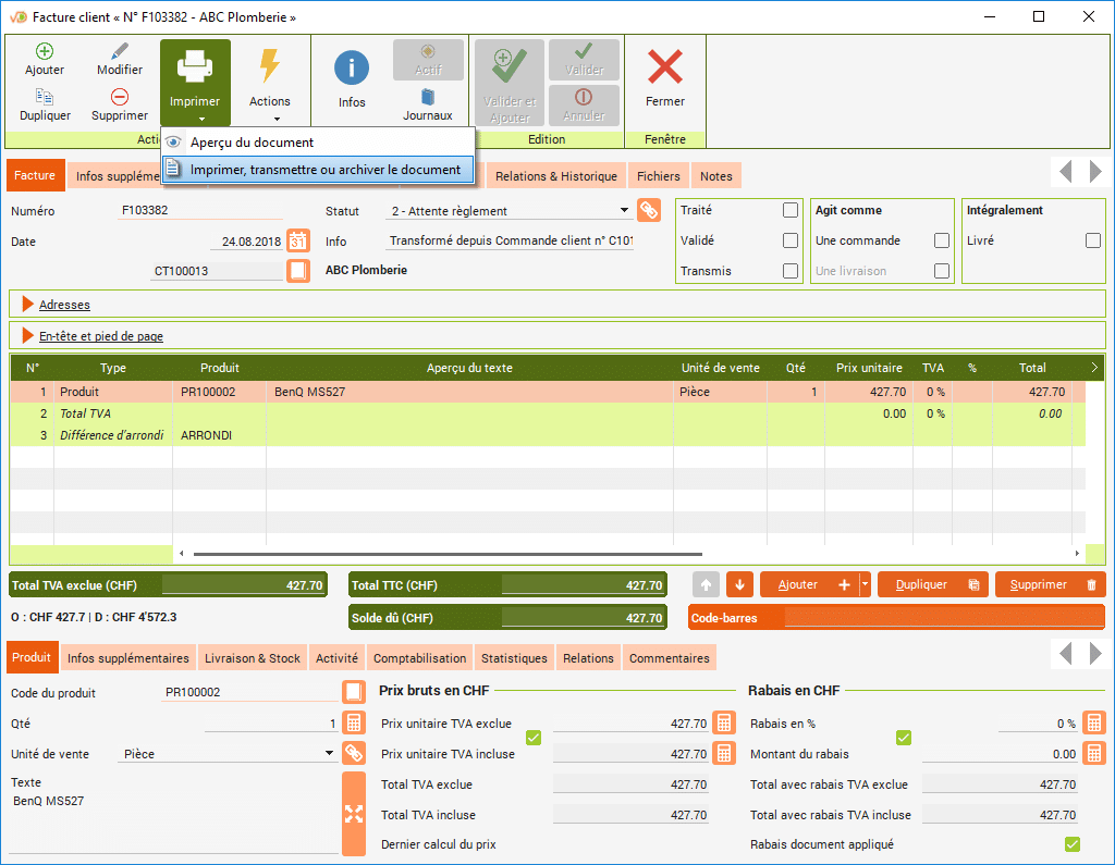 Choisissez l’action selon si vous voulez imprimer la facture ou la transmettre par email à votre client.