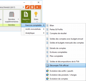 Dans le ruban « Compta », cliquez sur « Rapports » puis sur « Exercice comptable » puis sur « Décompte TVA officiel ».