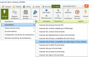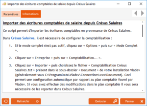 Dans le ruban « Outils », cliquez sur « Scripts » puis sur « Importations » puis sur « Importer des écritures comptables de salaire depuis Crésus Salaires ».