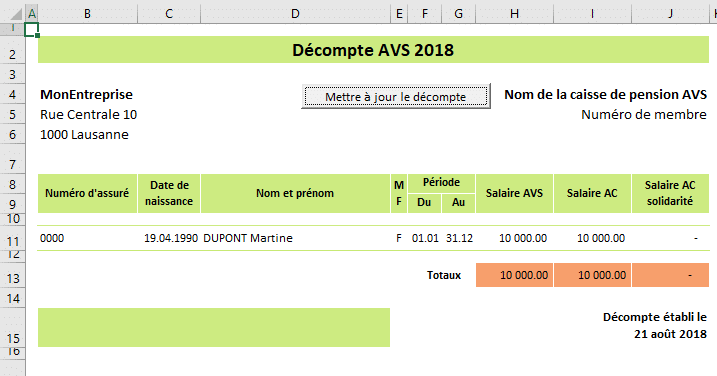 Si l'entité est renseignée, tous les employés liés à l'entité seront ajoutés automatiquement avec leurs données respectives (date de naissance, adresse, période d'activité, etc.). Les changements en cours d'année devront être effectués directement dans le fichier Excel.