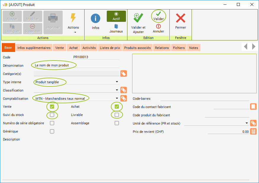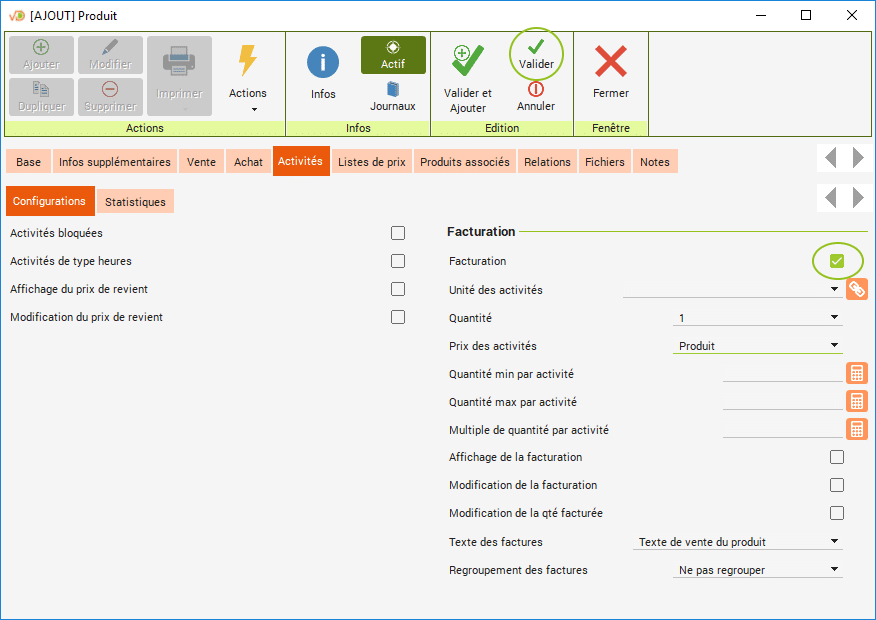 Si vous souhaitez pouvoir facturer ce produit dans des activités, naviguez dans l’onglet « Activités ».