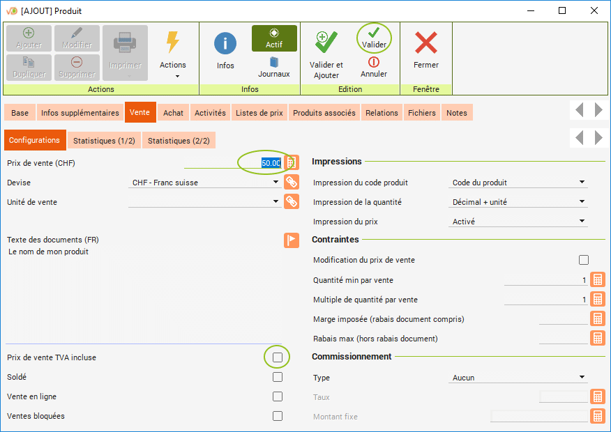 Modifiez le prix de vente et indiquez si le prix de vente est TVA incluse ou non.