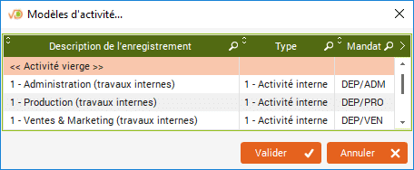 Si vous avez créé des modèles d'activité, sélectionnez le modèle à utiliser puis cliquez sur « Valider ».