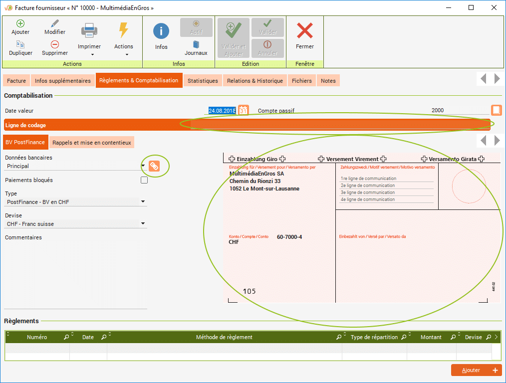 Si vous utilisez un lecteur optique, vous pouvez scanner la ligne de codage. Dans le cas contraire, renseignez les données du bulletin de versement ou les coordonnées bancaires afin de permettre un virement.