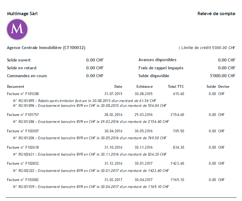 Le relevé de compte est ouvert avec un récapitulatif de la situation financière avec le client et la liste de toutes les factures et notes de crédit, règlements y compris.