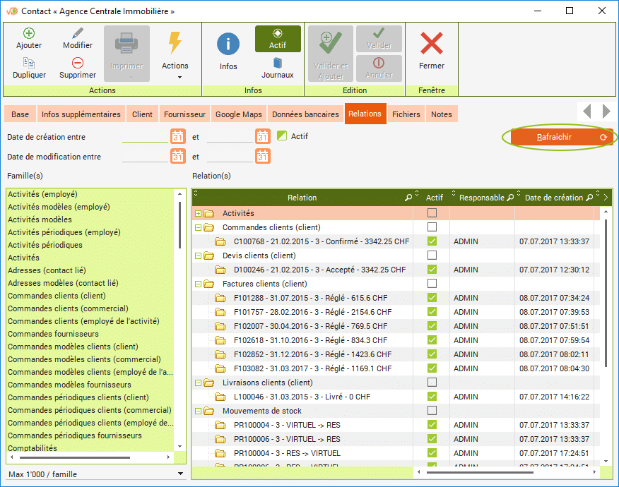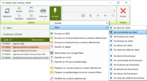 Cliquez sur « Actions », puis sur « Gérer » puis sur « les commandes du client » ou sur « les factures du client ».
