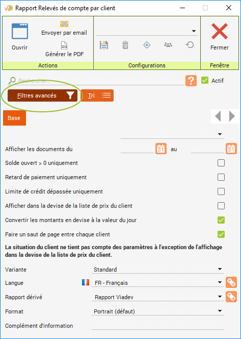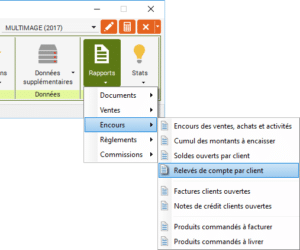 Dans le ruban « Ventes », cliquez sur « Rapports » puis sur « Encours » puis sur « Relevés de compte par client ».